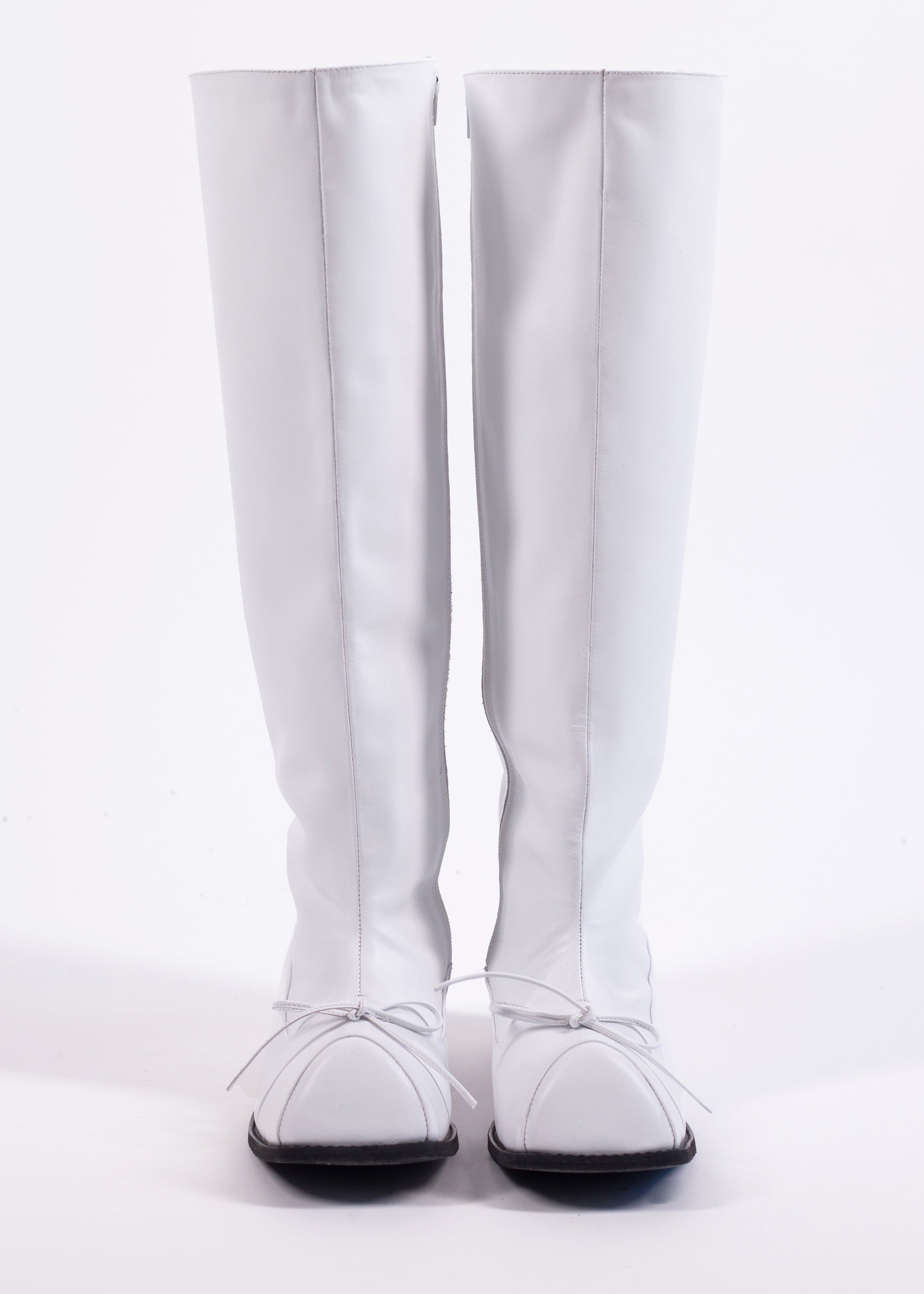 HOFA boots made in a white Nappa leather. Square toe, covered wedge heel. Leather bow. Handcrafted in Lithuania.